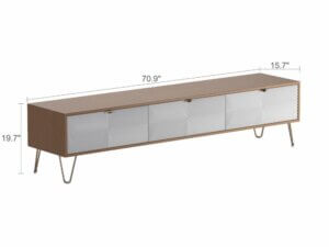 This modern TV stand is a perfect blend of style and functionality, adding a touch of elegance and practicality to your interior. Crafted from a combination of natural wood and premium E1-grade manufactured materials, it offers durability without any unpleasant odors. The walnut-colored laminated surface is smooth, fade-resistant, and easy to clean, making it an ideal choice for any living space.